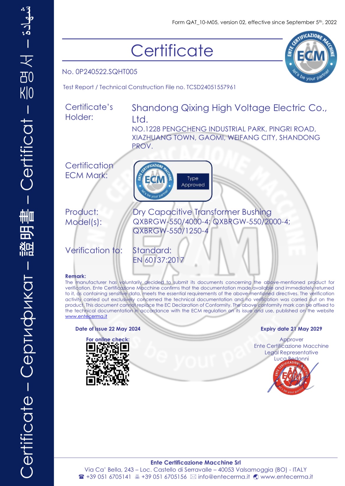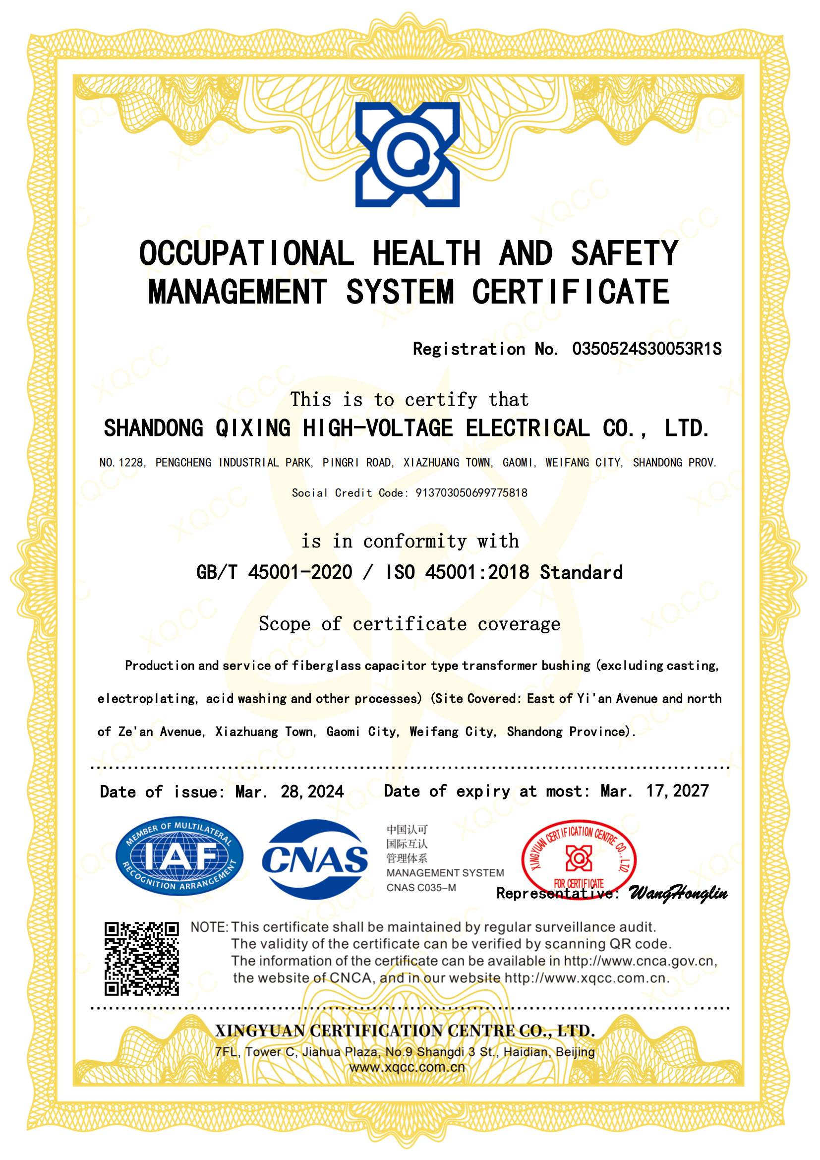 Shandong Qixing High Voltage Bushing Co., Ltd. является сертифицированным производителем, стремящимся к совершенству и инновациям. Наша интегрированная система управления сертифицирована по стандартам ISO 9001 (Качество), ISO 45001 (Охрана труда и безопасность) и ISO 14001 (Экология). Наша продукция имеет маркировку CE и полностью соответствует европейским директивам по безопасности и производительности. Для подтверждения нашего технического лидерства у нас есть 17 патентов, которые защищают наши запатентованные конструкции и передовые производственные процессы.